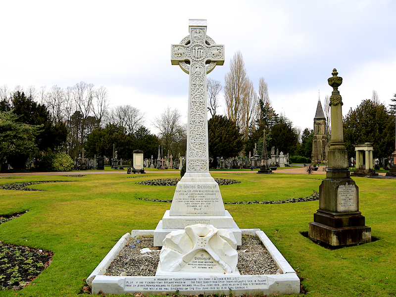 - A grade II listed monument in the form of a white marble Celtic cross commemorates Sir John Alcock, who piloted the first non-stop trans-Atlantic aircraft flight from Newfoundland to Clifden, Ireland in June 1919.