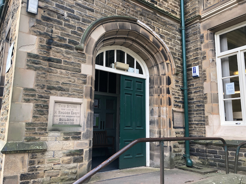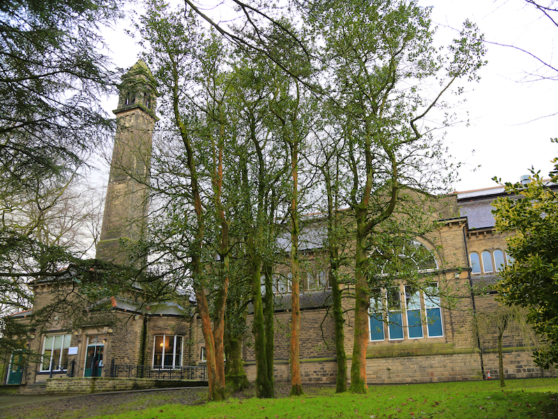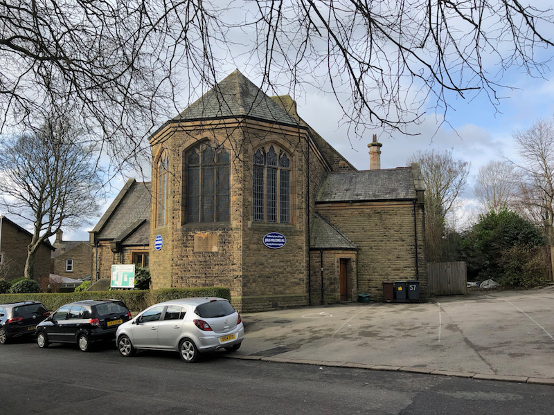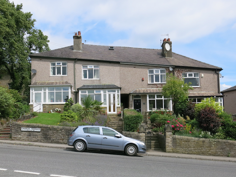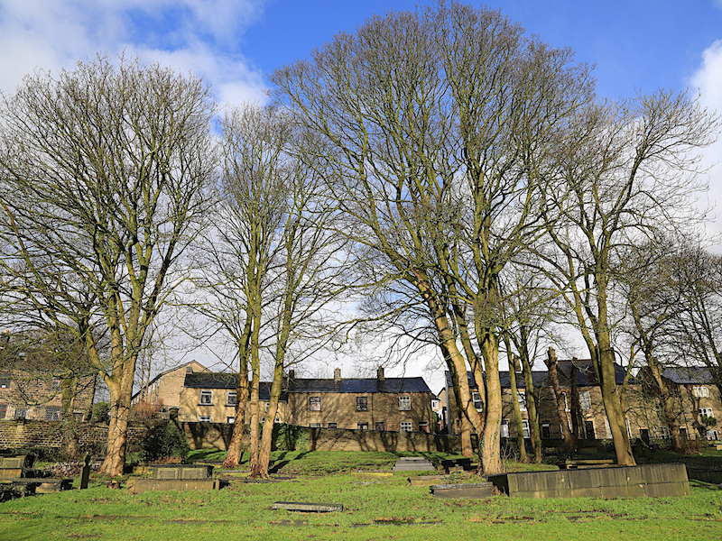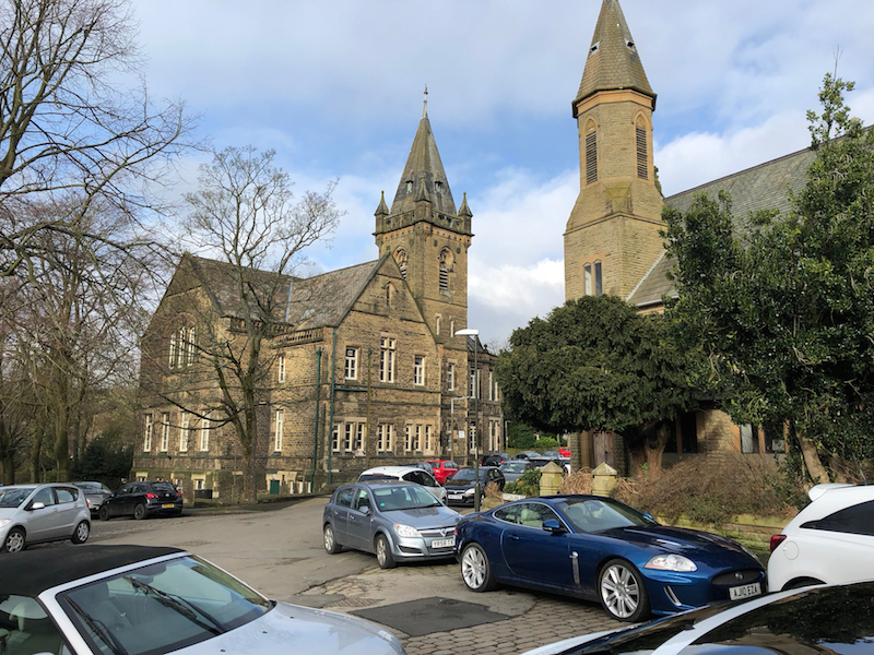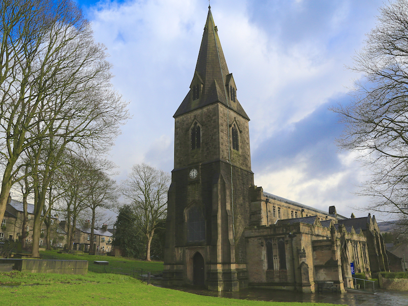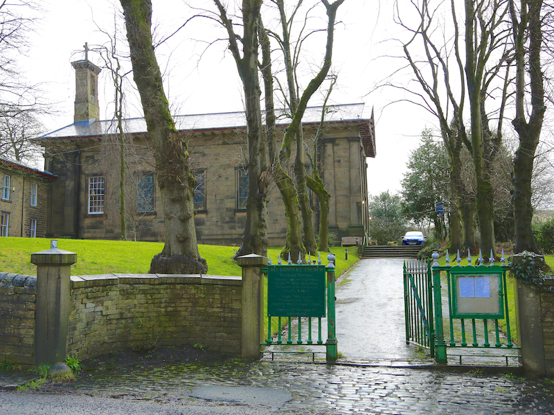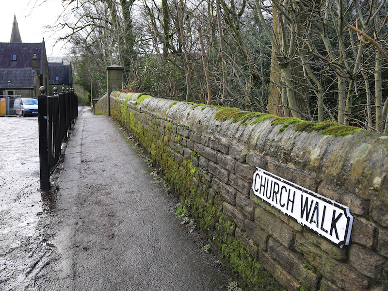 9. Hall Meadow Rd rises and becomes Church Terrace, then Church Road. At the Shire Hill Hospital sign take Church Walk straight ahead into the churchyard.