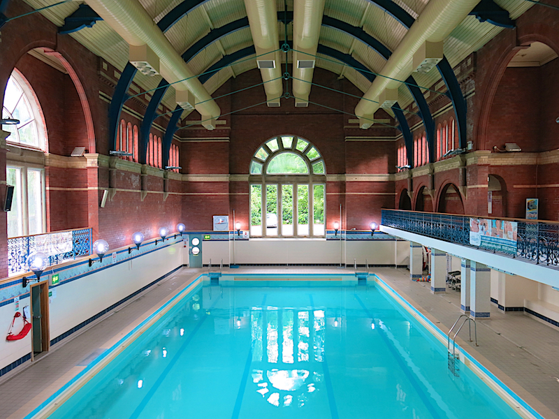 6. Descend through the park, taking the path down to the left, aiming for the imposing Victorian swimming baths at the foot of the hill.