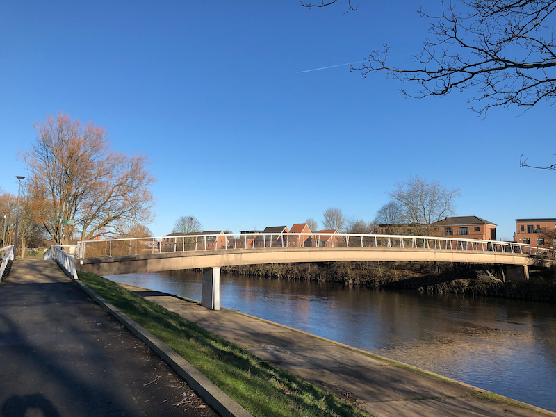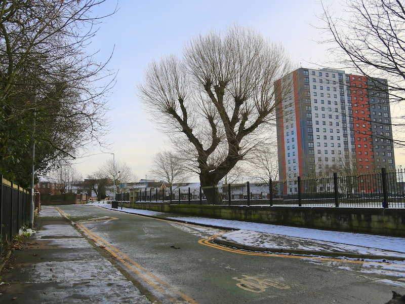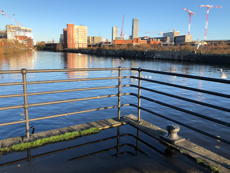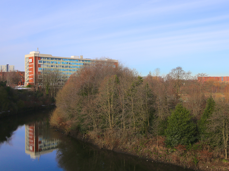 5. From St Philip’s, turn left, then right, then left to return to Chapel Street, turn right and continue past the former Salford Royal Hospital, straight on at the junction with Adelphi Street, towards the University of Salford campus, with the River Irwell in a valley on the right.