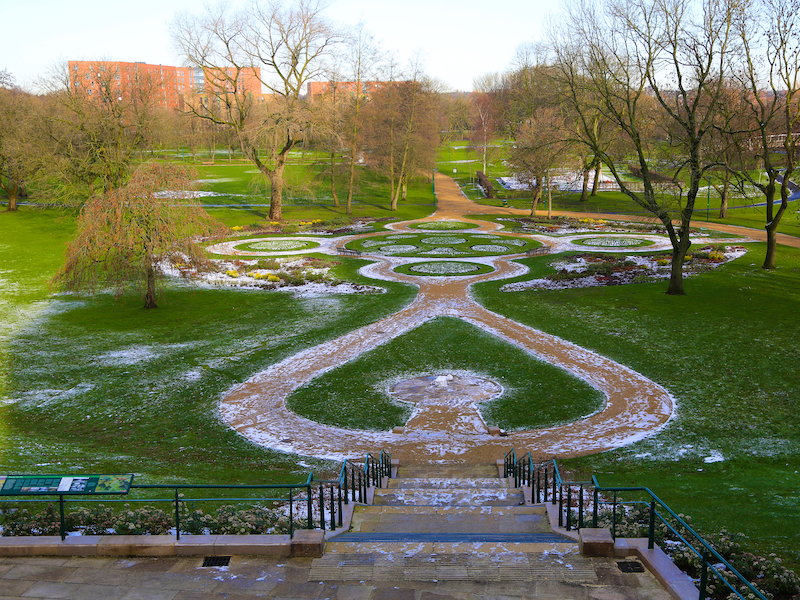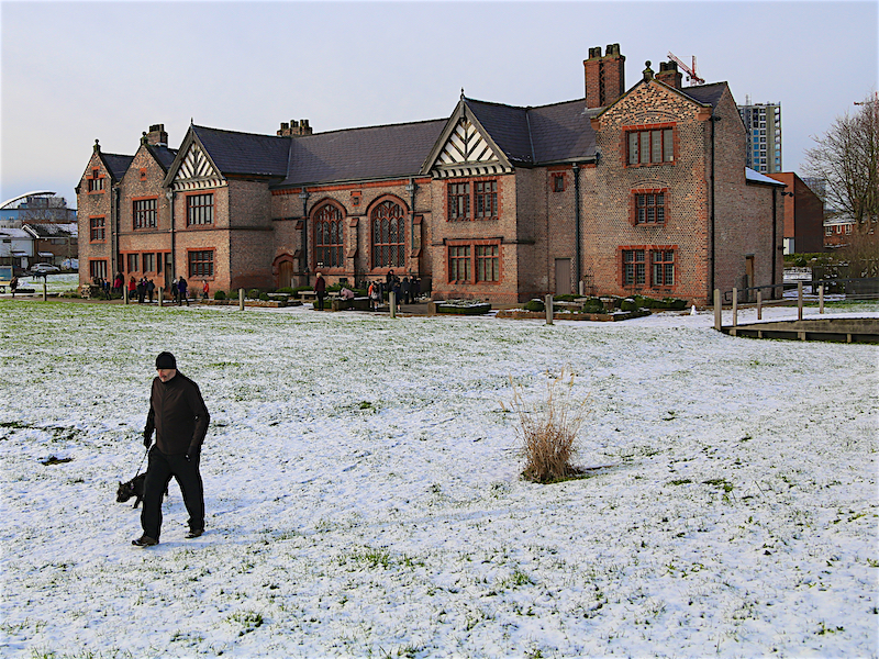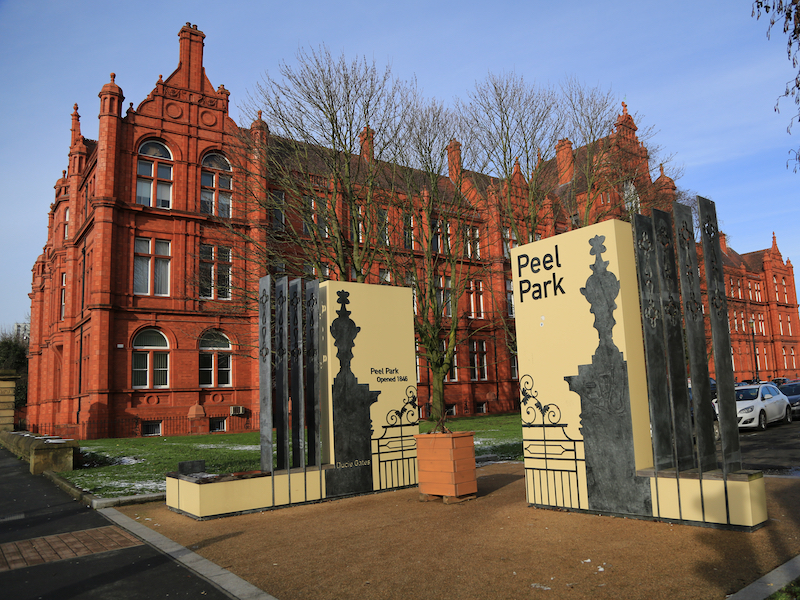 6. Pass the University’s Maxwell Building on the right and then turn right into the park at the entrance to the campus. On the far side of the green is the redbrick Peel Building. Go to the right of the Museum and Art Gallery.