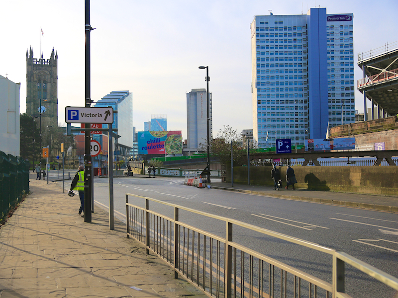 1. This walk starts at Manchester Victoria station. Leave the station on to Victoria Station approach and turn right towards the Manchester Arena and then left down Hunts Bank, by the Arena steps to Victoria Street. Turn left on to Victoria Street and then, at the start of the pedestrianised area, before reaching Manchester Cathedral, bear right into Chapel Street, crossing the River Irwell.