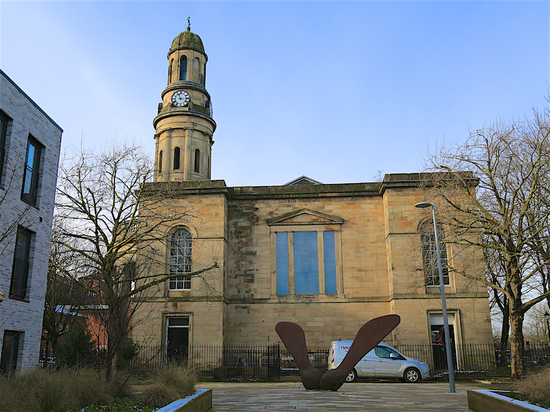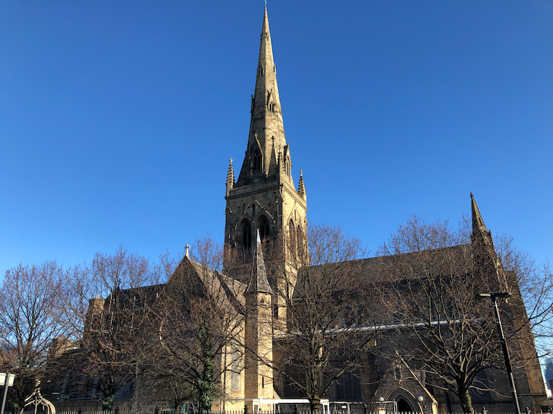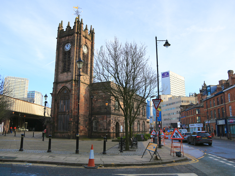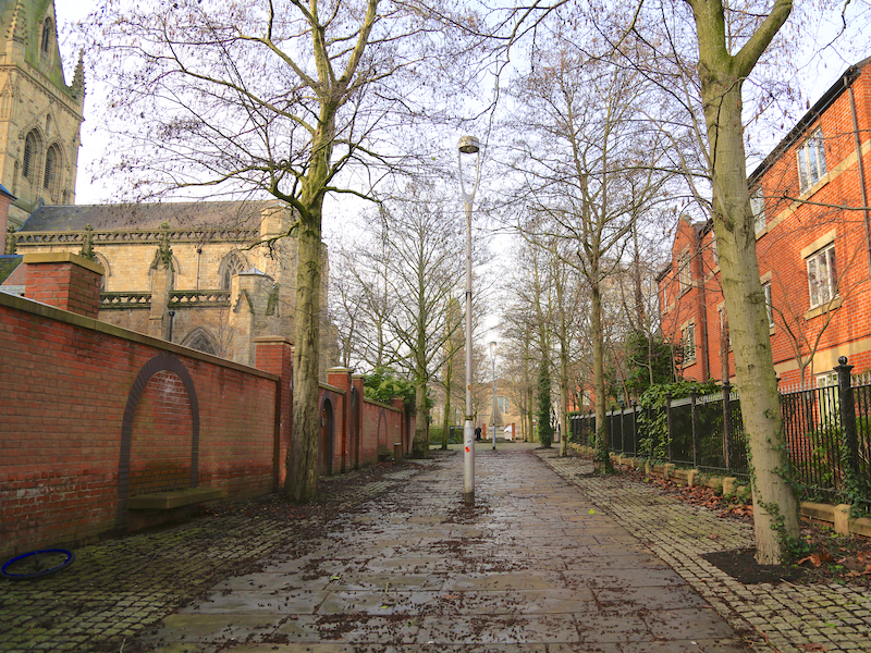 4. Leave Bexley Square to the left, turning right at the left side of the Town Hall, along Ford Street. Turn left along a pathway beside some modern apartments, past St John’s Square towards St Philip’s Square. Pass Salford Cathedral on the left.