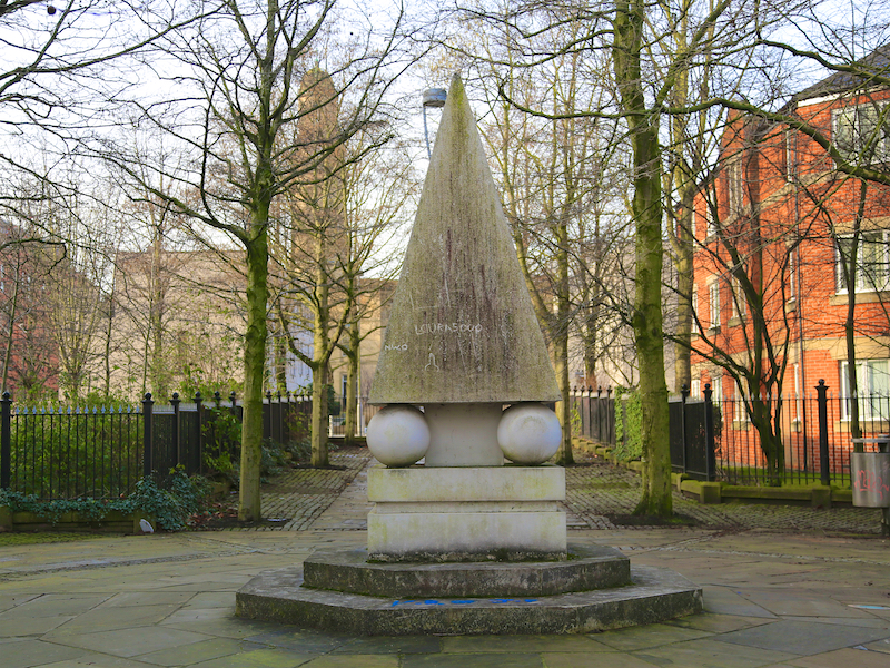 In November 1866 the River Irwell burst its banks, flooding much of Lower Broughton. The flood was said to be “more extensive and devastating in its effects than perhaps any that has occurred in this locality within the memory of living man”. Three men were drowned and many others, including the keeper of the park, had to be rescued from the upper storeys of their homes. As part of a general renovation of the park a granite flood obelisk was erected in 1867 with a flood marker on two faces showing the height of 8 feet 6 inches.