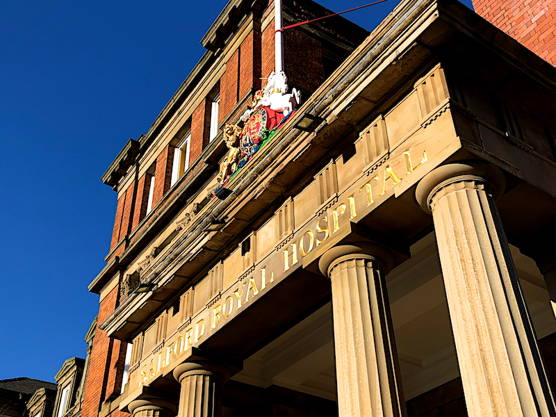 The original hospital in Salford was established in 1827, known as the Salford and Pendleton Dispensary. It became the Salford and Pendleton Royal Hospital and Dispensary in 1847 and the Salford Royal Hospital in the 1870s. In June 1941, during the Manchester Blitz, the hospital was struck by German bombs and 14 nurses died. Following the formation of the NHS Trust in 1990 and budget cuts imposed by the Government in the early 1990s, the hospital on Chapel Street closed in 1994 and was converted into luxury flats. A memorial stone tablet to commemorate the nurses killed during the blitz remains above the original Chapel Street entrance.