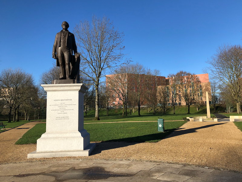 7. Walk to the right of the Museum and Art Gallery, to the left of some more modern buildings and turn left at the railings with a view down on to the extensive Peel Park. Descend the steps and walk anti-clockwise around the park noting the modern footbridge over the Irwell on the right. Turn left at the statue of Joseph Brotherton and to its rear the small obelisk.