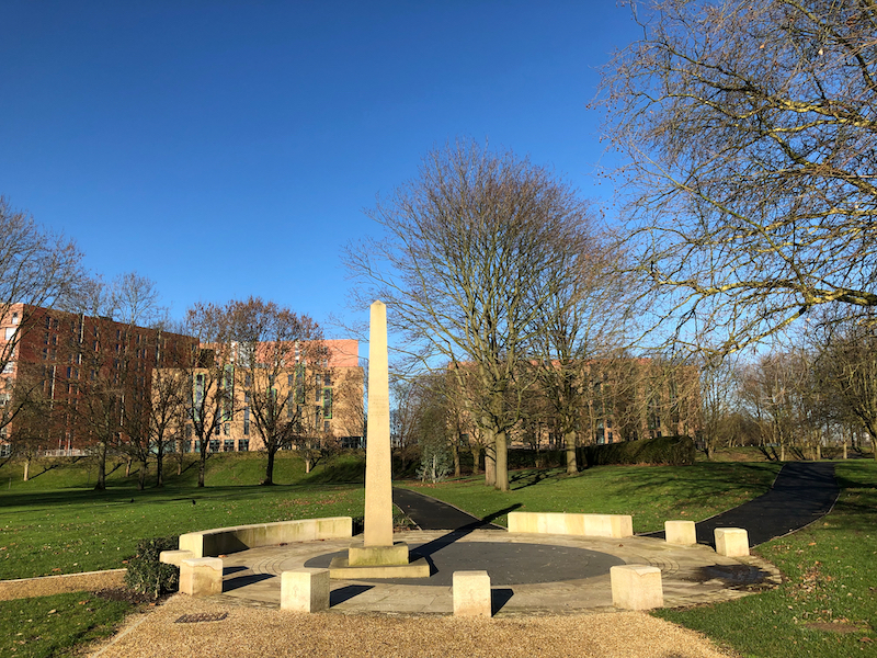 8. Continue past the Brotherton statue and the obelisk and climb steps up from the park towards some more university buildings on a rise. At the top of the steps turn left and follow paths, passing the Museum and Art Gallery on the left and the Peel building on the right. At the main road, The Crescent, cross to the far side to view the Working Class Movement library and turn left again.