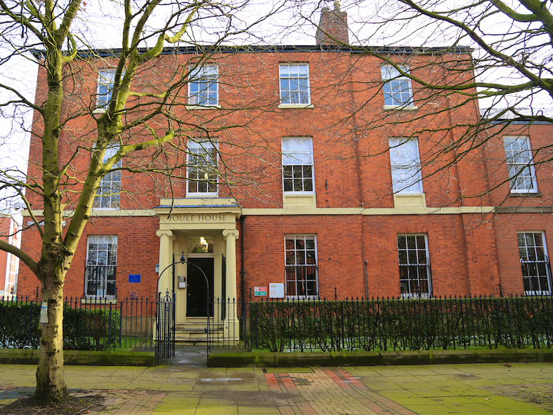 The next building on the left is Joule House, named after James Prescot Joule, who lived and worked here. Joule was a noted physicist who established the principle of the mechanical equivalent of heat. His name has been given to the unit of energy, the joule. To the left is The Crescent, said to be Salford’s most elegant street with a row of Georgian brick-built houses built in the 1820s, opposite the University Campus.