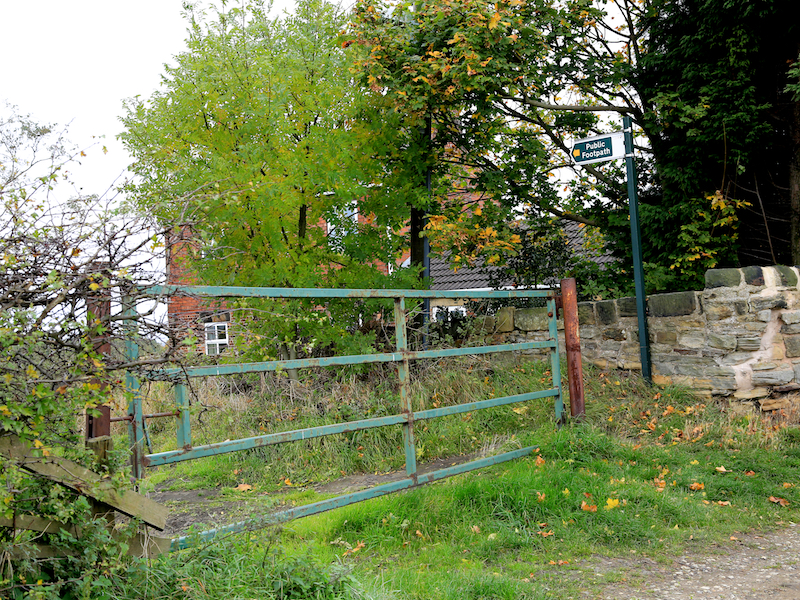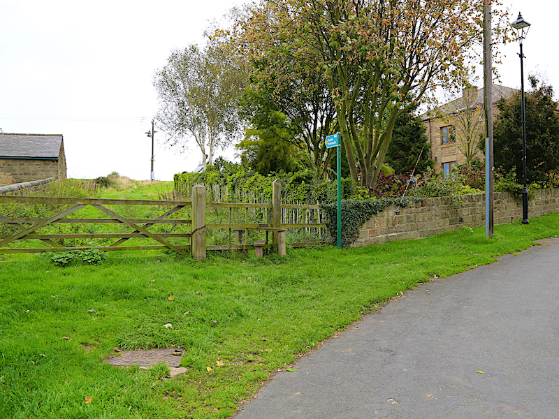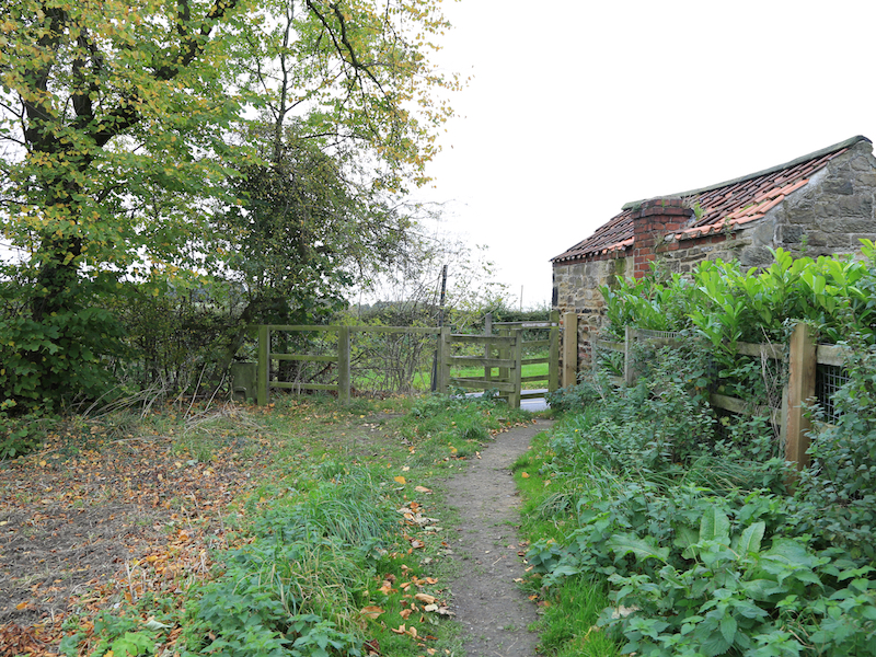 8. The road passes through a gate, and back to the hamlet referred to in 5 above. Opposite the houses a path turns left across fields and down the hill the busy B6091, Cortworth Lane.