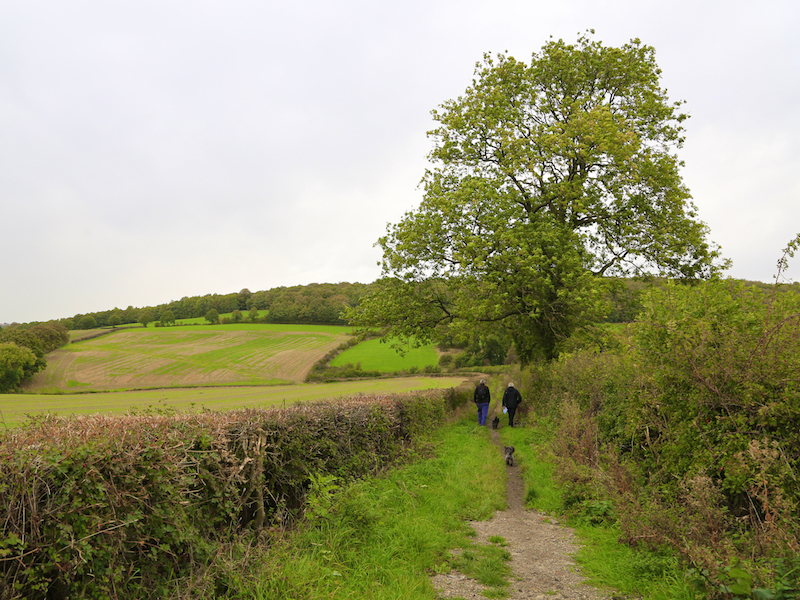 16. At this point, follow the path right across the next two fields, turning left at an oak tree, and continuing enter the woodlands (called King’s Wood) at a five-bar gate.