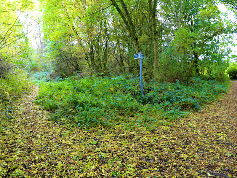 2. Return to the car park and follow the tarmac footpath running right along the wall of the Heritage Village. The path quickly reaches some scrubby woodland. Enter the woodland and continue uphill on the paths to the left of the sign.