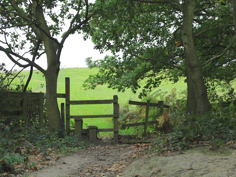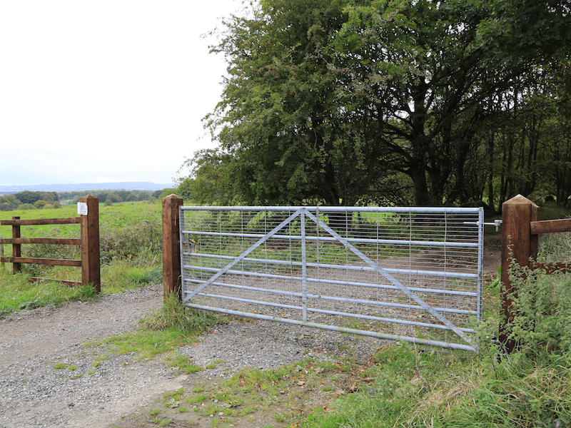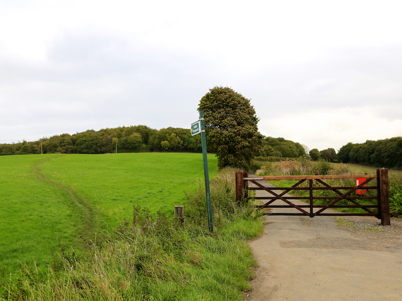 15. Continue on this path and, shortly after a junction of three paths, at a gate follow the path right between two hedges, descending to a gap in the hedges.