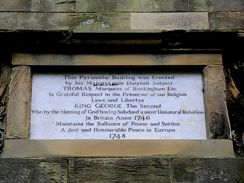 This 98ft tower, designed by Henry Flitcroft, was erected by the first Marquess of Rockingham betrween 1747and 1749 to commemorate the quashing of the 1746 Jacobite rebellion. The three walls under the cupola may represent England, Scotland and Wales. The marquess (then plain Earl of Melton) fought for the British Government, which led to his elevation